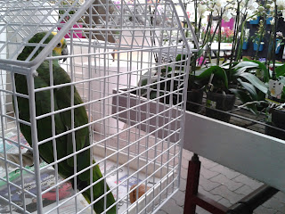 De amazone was nog niet zo in de mood. Met flitsende ogen en een waaierstaart durfde ik hem niet mee te nemen. Het lekkers heeft hij wel tevreden (nadat hij al zijn brokjes op had) in ontvangst genomen en hij heeft er ook van gesnoept.